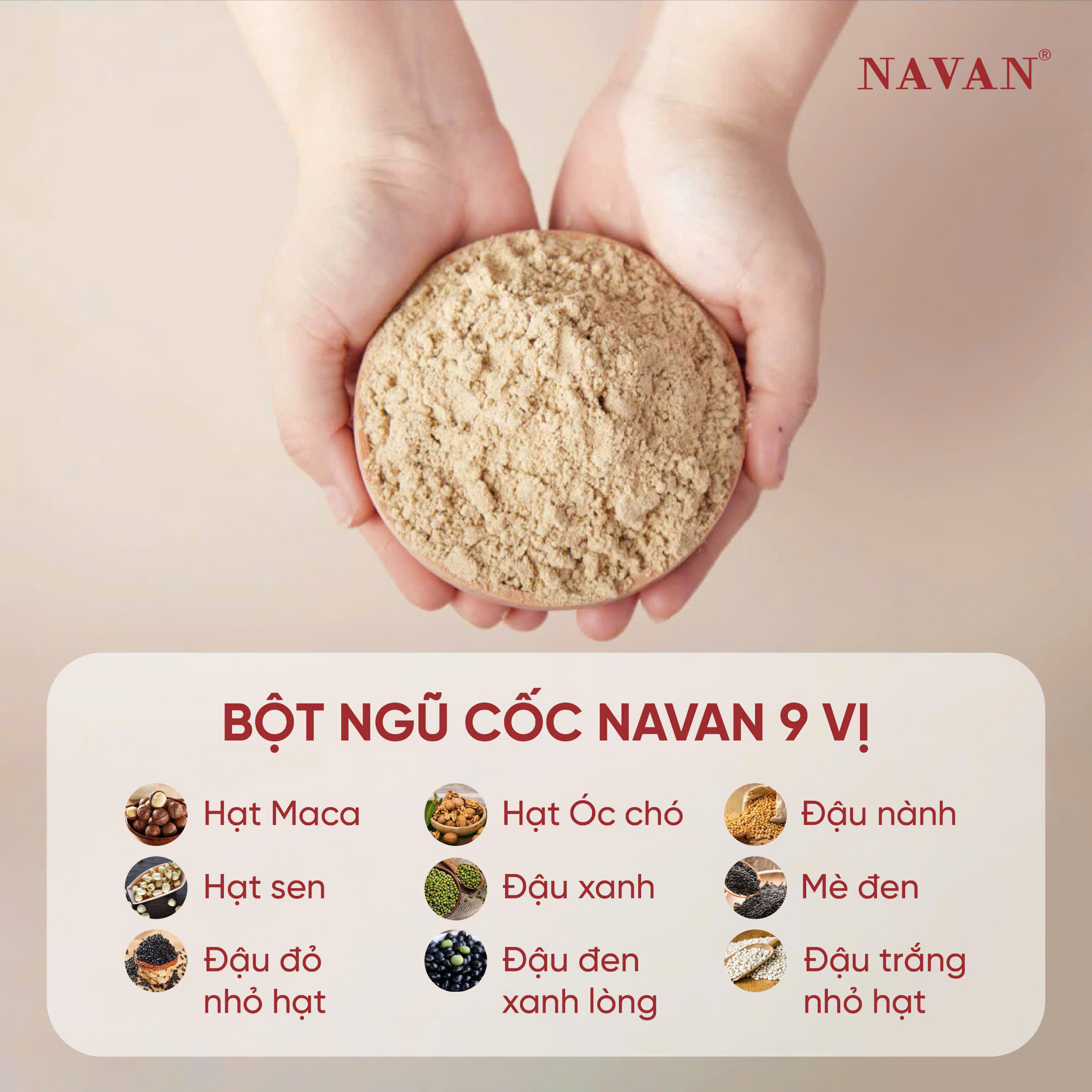 Thành phần bột ngũ cốc Navan gồm 9 loại hạt: hạt macca, hạt óc chó, hạt đậu đỏ, hạt sen, đậu đen, đậu nành, đậu trắng, đen và đậu xanh.