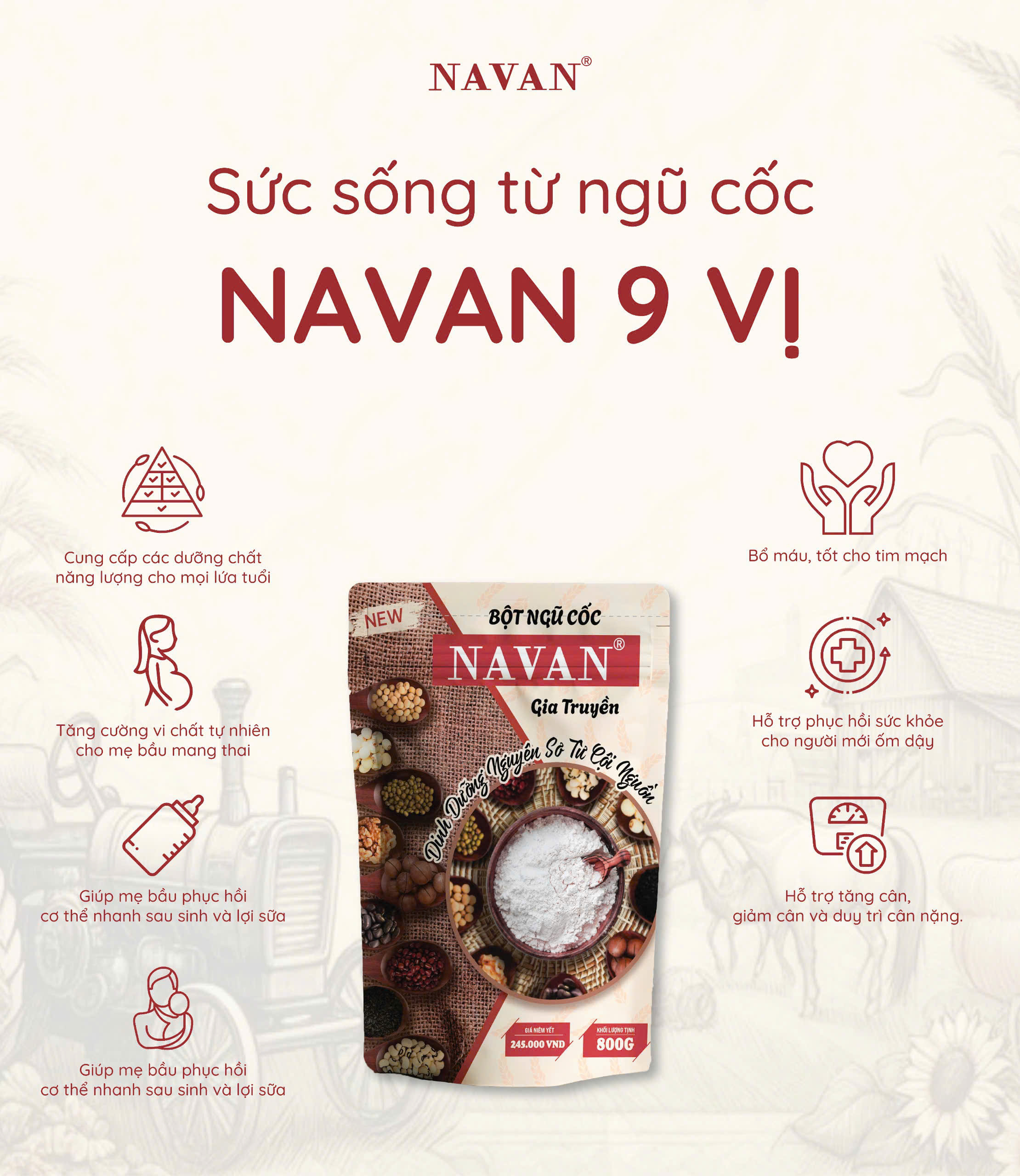 Với công thức gia truyền kết hợp, lưu giữ tinh tuý dinh dưỡng, hương vị từ 9 loại hạt: Hạt macca, óc chó, hạt sen, đậu đỏ, đậu nành, mè đen, đậu xanh, đậu trắng, đậu đen, nhiều chuyên gia đánh giá Bột Ngũ cốc Navan thuần Việt – chăm sóc sức khoẻ người Việt khi mang lại nhiều công dụng tuyệt vời như cung cấp các dưỡng chất, năng lượng cho mọi lứa tuổi, tăng cường vi chất tự nhiên cho mẹ bầu mang thai, giúp mẹ bầu phục hồi cơ thể nhanh sau sinh và lợi sữa. Bột dinh dưỡng cũng đem lại nguồn dinh dưỡng cho mẹ và bé, hỗ trợ phục hồi sức khỏe cho người mới ốm dậy, bổ máu, tốt cho tim mạch, hỗ trợ tăng cân, giảm cân và duy trì cân nặng.